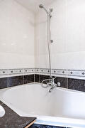 De moderne, dichte keuken is voorzien van diverse inbouwapparatuur en een deur naar de tuin. Via de achterhal bereik je de slaapkamer en de nette badkamer met hoekbad en vaste wastafel.