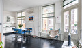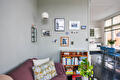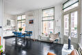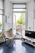 Overloop met vaste kast, toilet en woonkamer met veel lichtinval door de grote raampartijen en een balkon met een fantastisch uitzicht op de gracht. Open keuken voorzien van diverse inbouwapparatuur.