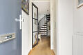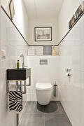 Entree/hal, modern toilet, woonkeuken met grote raampartijen. De keuken (Bulthaup) is voorzien van diverse inbouwapparatuur met een granieten hoog werkblad. En een ruime inpandige berging met een toegangsdeur naar de gemeenschappelijke tuin met een achterom.